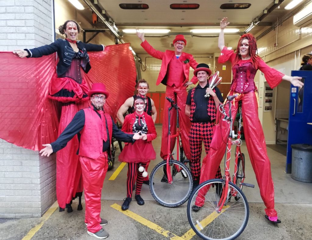 Our stiltwalkers are brightly coloured , and yes, we can also ride bikes whilst wearing stilts.