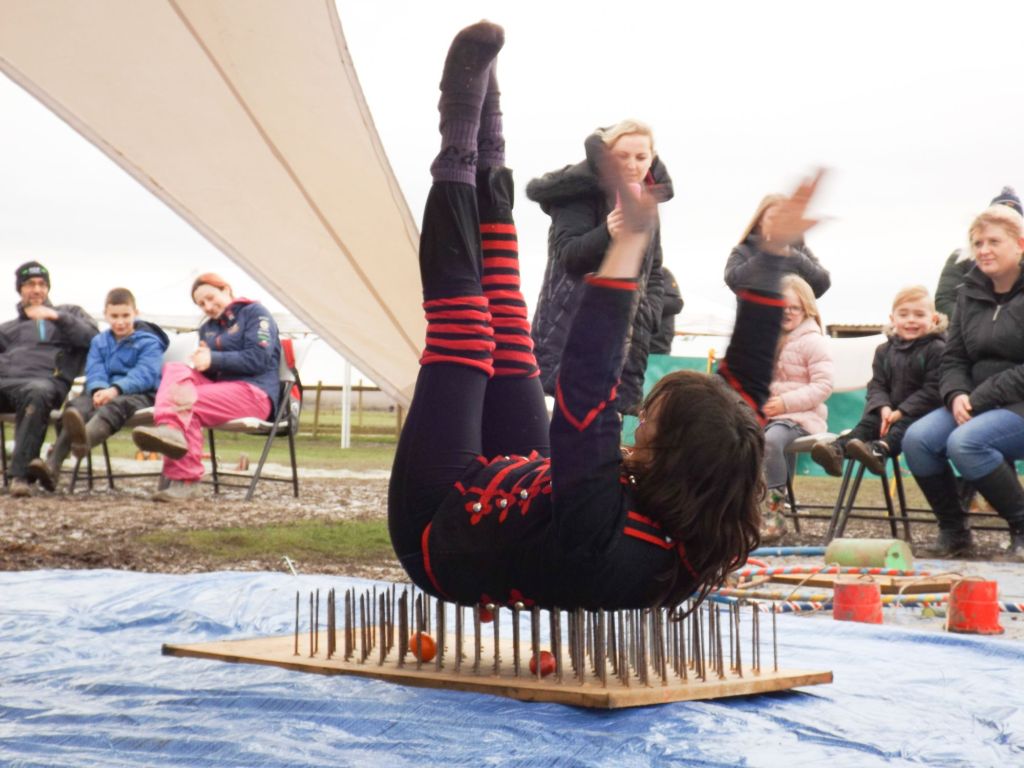 The photo here is a moment from a children’s circus show when we lay on a bed of nails, a volunteer from the audience usually stands on top of us. . It can be extremely uncomfortable ! At one school we gave the children a choice of which trick to end the show with , they all started chanting “bed of Nails , Bed of Nails ! ”
