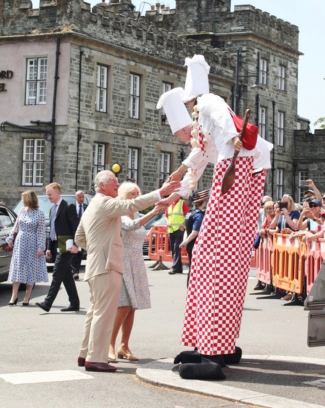 The stilt chefs have performed at a great number of culinary events , including greeting Prince Charles and Camilla as they arrived in Tavistock to visit the food festival. The sun newspaper captured the moment with the headline “Your Highness”